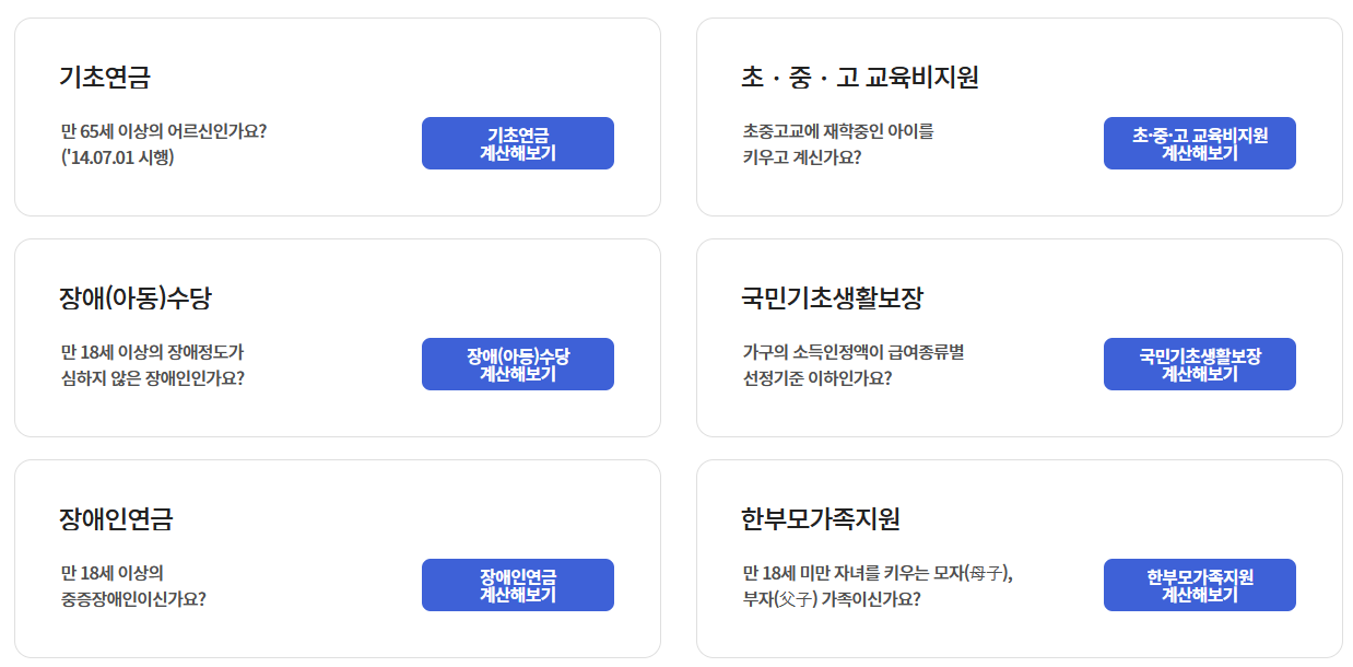 혹시 본인이 해당 기준에 포함되는지 헷갈린다면, 보건복지부 '복지로'에서 제공하는 ‘복지서비스 모의계산’을 활용해보는 것이 어떨까요?