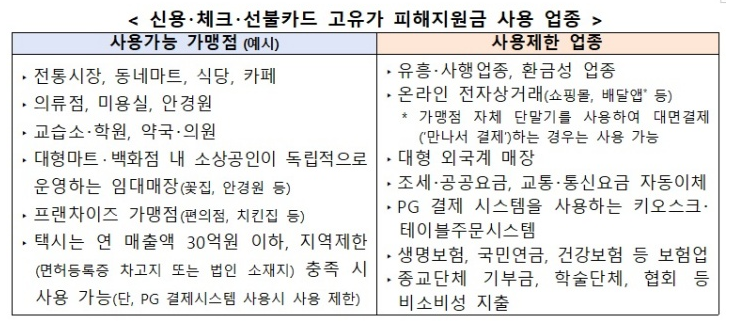 이번 정책은 대형 마트나 백화점이 아닌 연 매출 30억 원 이하의 동네 소상공인 매장에서만 돈을 쓰도록 규정하여 골목 상권을 보호합니다.