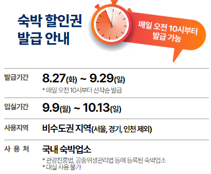 숙박 할인권은 2024년 8월 27일부터 9월 29일까지 발급 및 예약이 가능해요. 이 기간 동안 할인권을 발급받아 원하는 숙박 시설을 예약할 수 있어요.