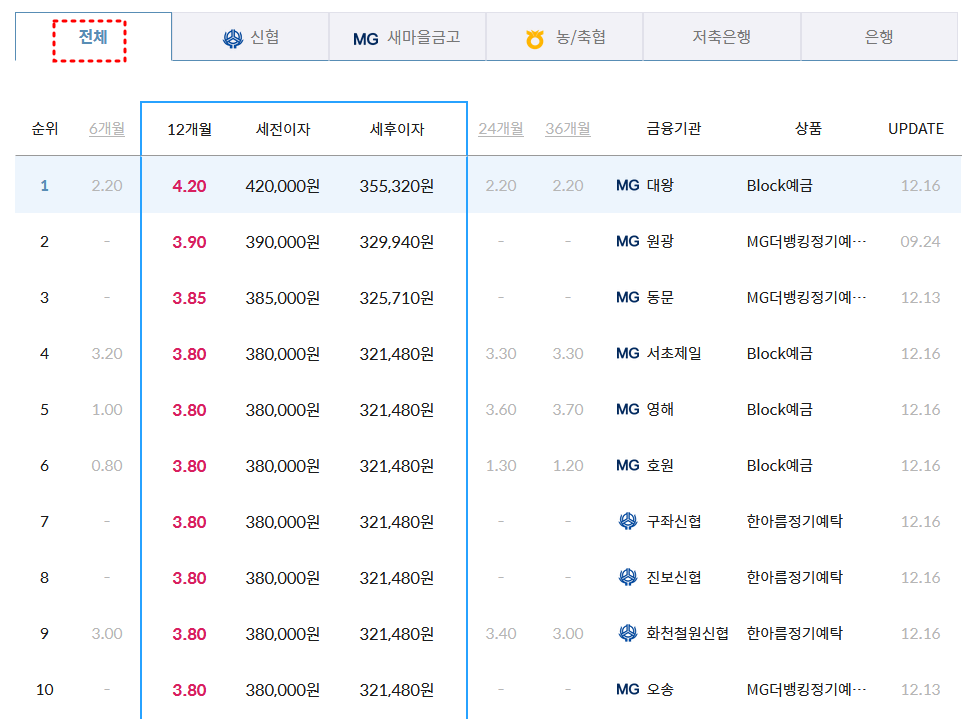 2024년 12월 16일 기준 정기예금 금리비교를 조회해보면, 새마을금고가 대부분 상위를 차지하고 있으며 12개월 거치기준 최고금리는 4.20%임을 확인할 수 있습니다.